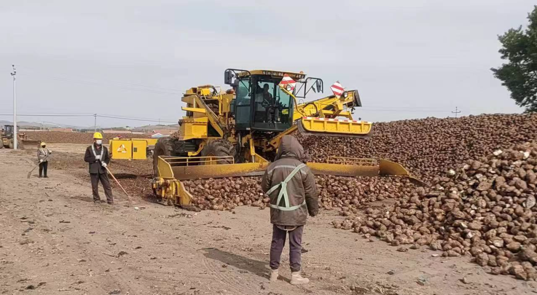 ▲內蒙古佰惠生公司將甜菜從地頭拉回公司的堆場后進行堆垛,圖中的羅霸機正在進行甜菜的堆垛工作。